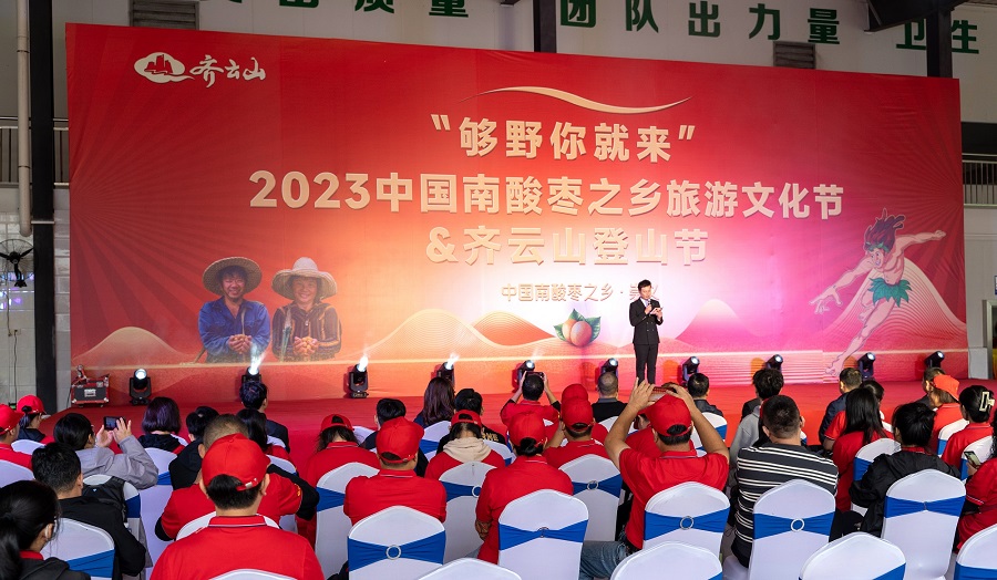 结束工厂参观,大家移步原料收购车间参加《中国南酸枣之乡旅游文化节》。江西齐云山食品有限公司营销中心总经理朱方永先生为活动致辞,崇义县委副书记唐祎泾宣布“够野你就来”——2023中国南酸枣之乡旅游文化节&齐云山登山节开幕。