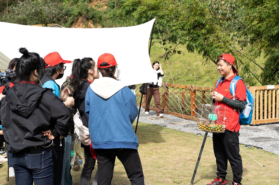 次日,大家来到国家4A级风景区——阳明山国家森林公园。在这难得一见的绿色宝库中,大家不仅游赏了需历经秋冬春夏秋五季13个月的云滋雾养,吸取日月精华和天地灵气的油茶树,还见到了树干挺直、高达20余米、直冲云霄的野生南酸枣树。在南酸枣下,大家一起体验了在落叶中、草丛中寻觅野生南酸枣、捡拾南酸枣的艰辛和乐趣。